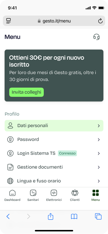 La funzione è disponibile direttamente in piattaforma, cliccando il pulsante menu, vedrai come prima cosa una card con il seguente titolo “Ottieni 30€ per ogni nuovo utente iscritto”.