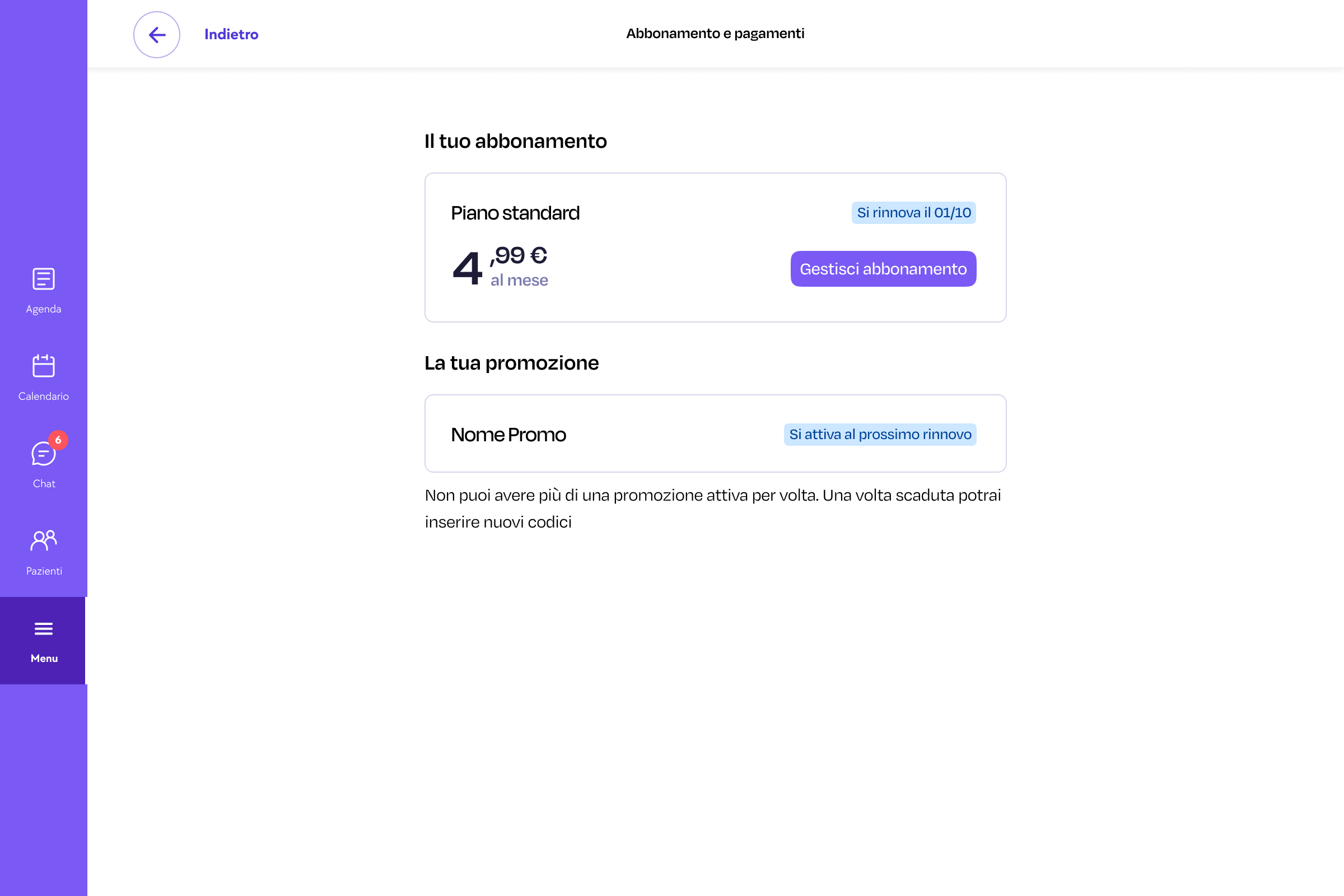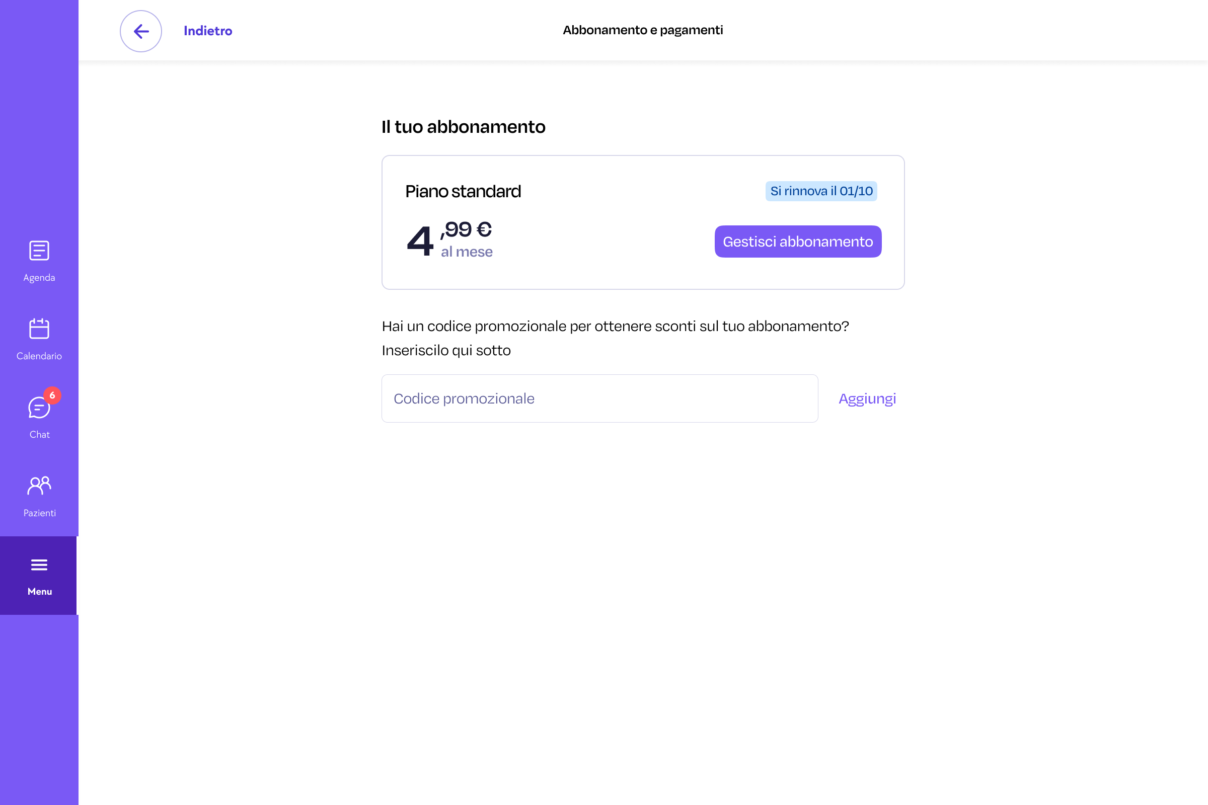 Se hai ricevuto un codice promozionale di Gesto puoi inserirlo nella pagina dedicata. Ti basta cliccare sul pulsante “Menu” nella spalla sinistra e successivamente selezionare “Abbonamento e pagamenti”.