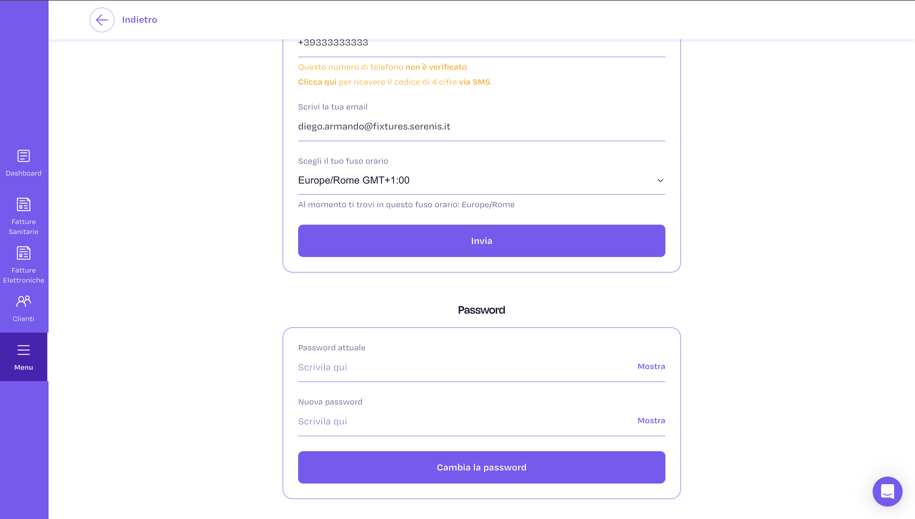 Tutti i tuoi dati anagrafici e di fatturazione sono raccolti nella sezione Dati di fatturazione, accessibili cliccando sull’icona del menu, nella spalla sinistra, alla voce “I tuoi dati di fatturazione”. All’interno della sezione potrai consultare tutte le informazioni che hai inserito in fase di registrazione e potrai inoltre modificarle.