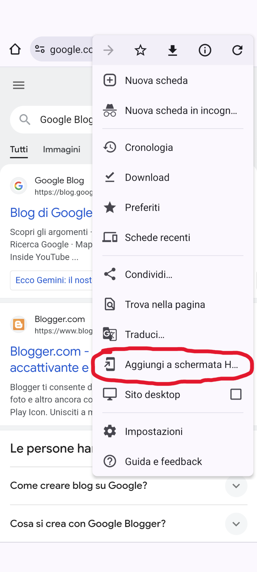 - Premete l’icona del menu (3 puntini nell’angolo in alto a destra dello schermo) e selezionate “Aggiungi alla schermata iniziale”;