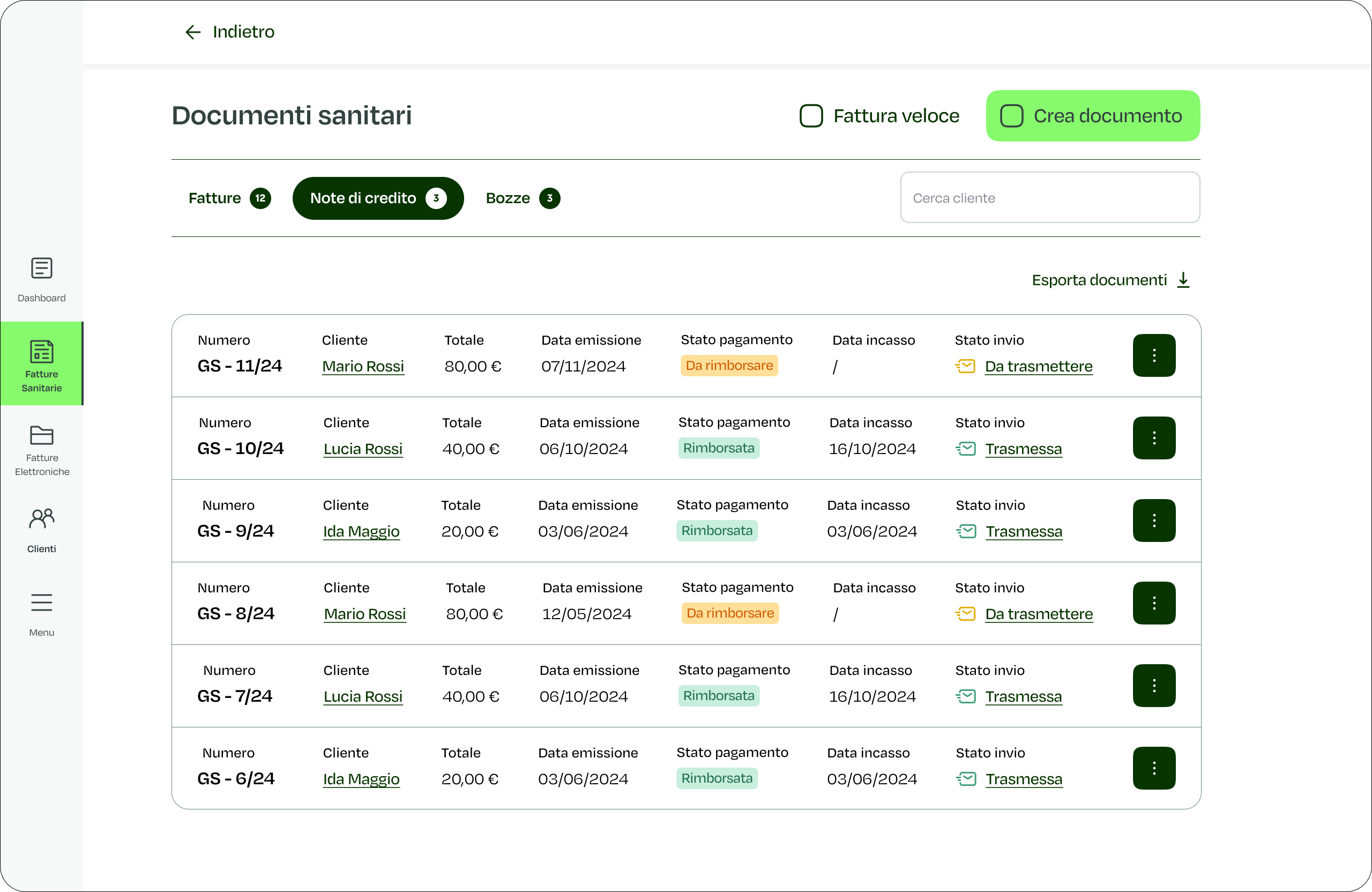 Nella sezione “Fatture Sanitarie” e “Fatture Elettroniche” puoi visualizzare tutte le Note di Credito emesse e il loro stato di trasmissione. Da qui, come per le fatture, è possibile visionarne il numero, il cliente a cui è stata emessa, l’importo rimborsato o da rimborsare e lo stato di trasmissione al sistema TS o SDI.