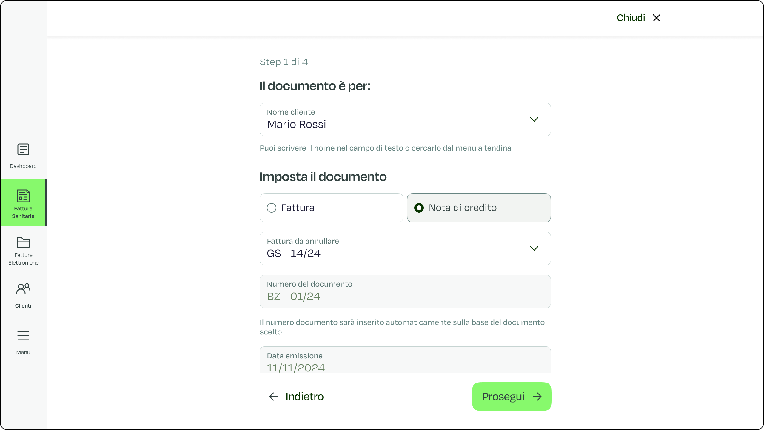 - Nella schermata che appare, seleziona il cliente, scegli “Nota di Credito” e seleziona il numero della fattura da annullare.