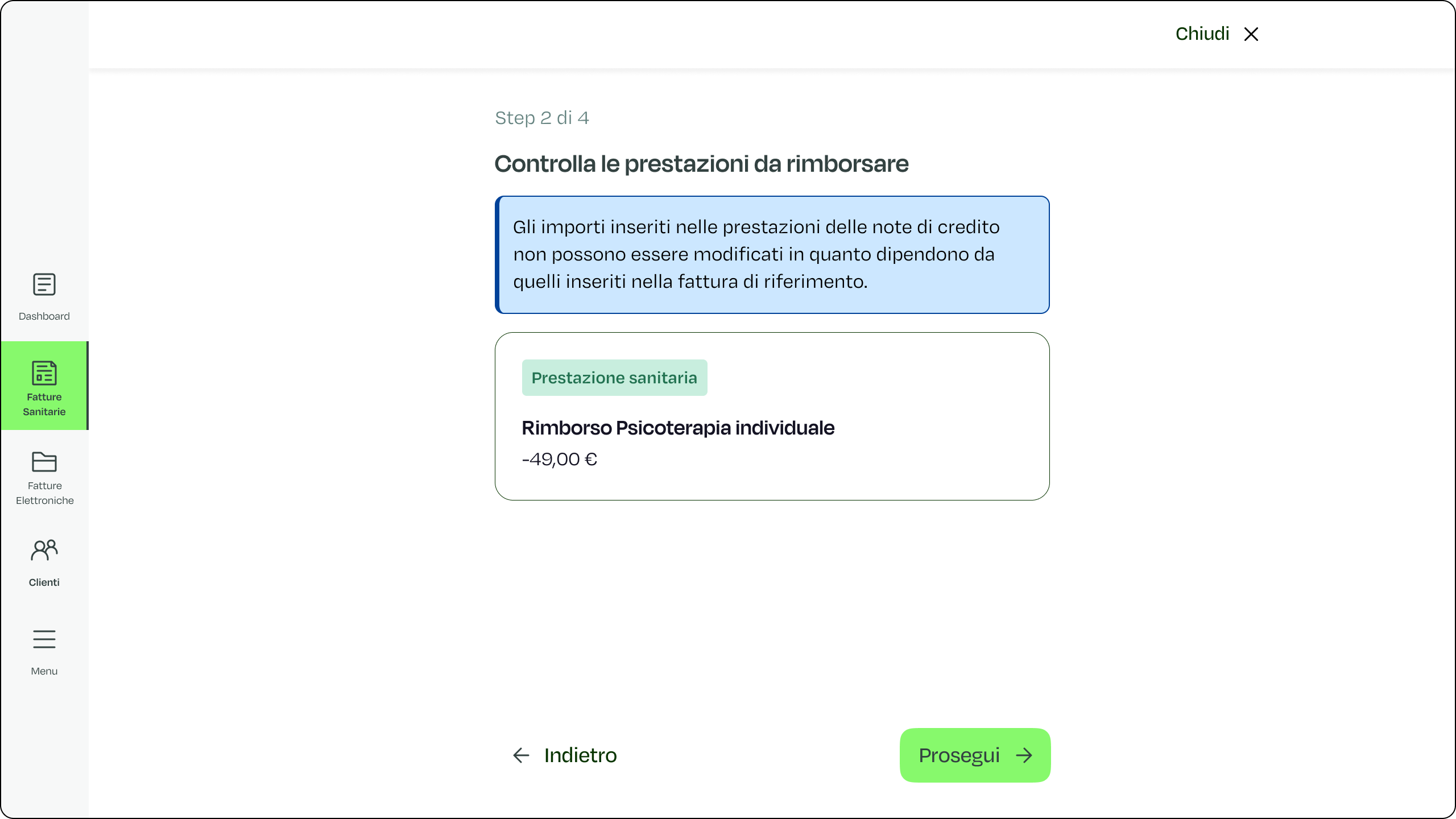 - Clicca su “Prosegui” per visualizzare, nel secondo step, il riepilogo delle prestazioni inserite nella fattura di riferimento e che si intende rimborsare. Una volta verificate le informazioni, è sufficiente premere nuovamente il pulsante “Prosegui”; Non è possibile modificare le prestazioni o l’importo. Gesto prevede esclusivamente il rimborso totale della fattura.