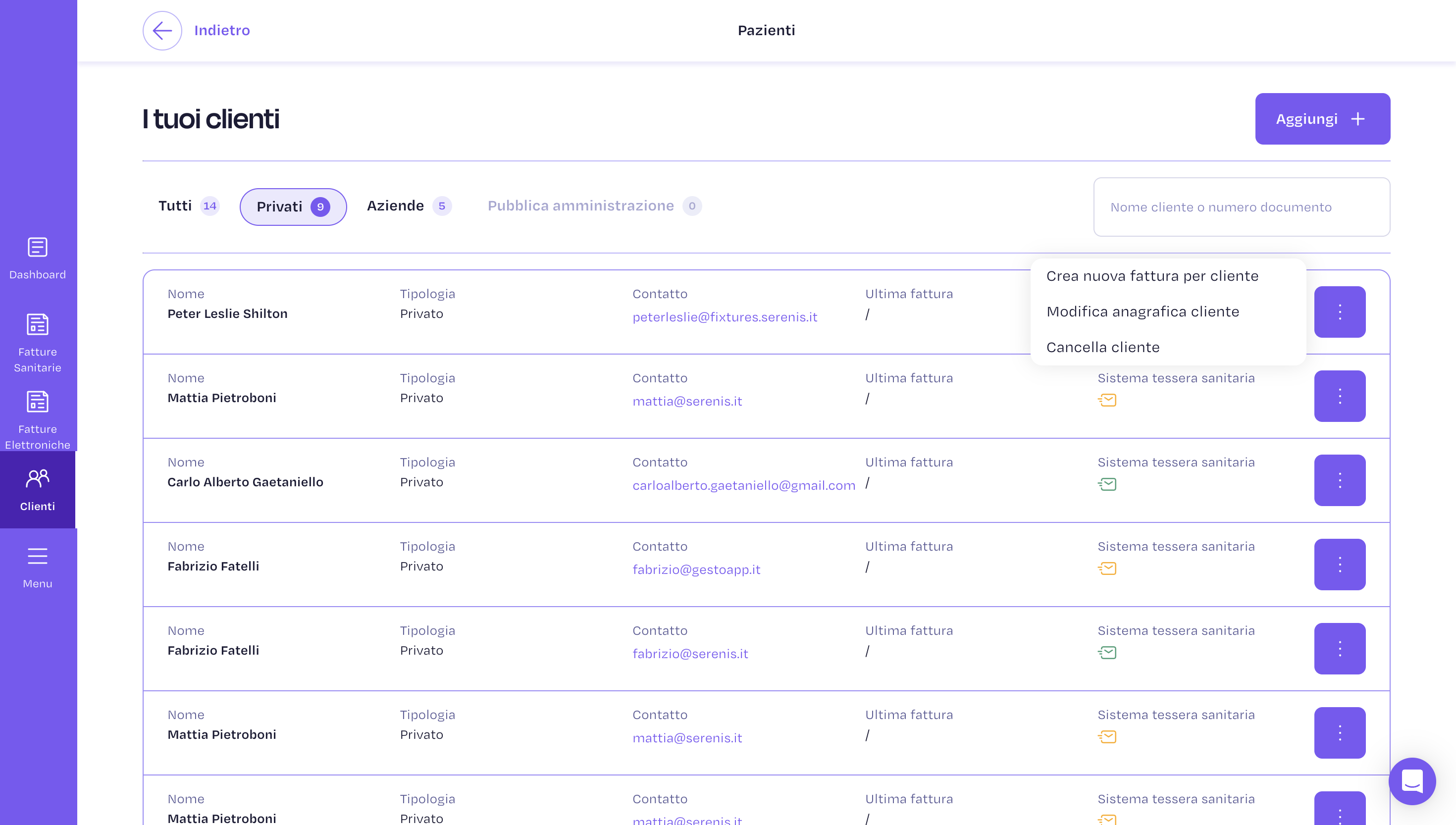 Puoi compiere un set minimo di azioni per ciascun cliente presente in lista, cliccando sul pulsante con i tre punti posizionato alla destra di ogni riga:- Potrai Creare una nuova fattura per il cliente selezionato. Questa azione ti porterà direttamente all’interno del flusso di creazione di un documento (qui trovi la guida);